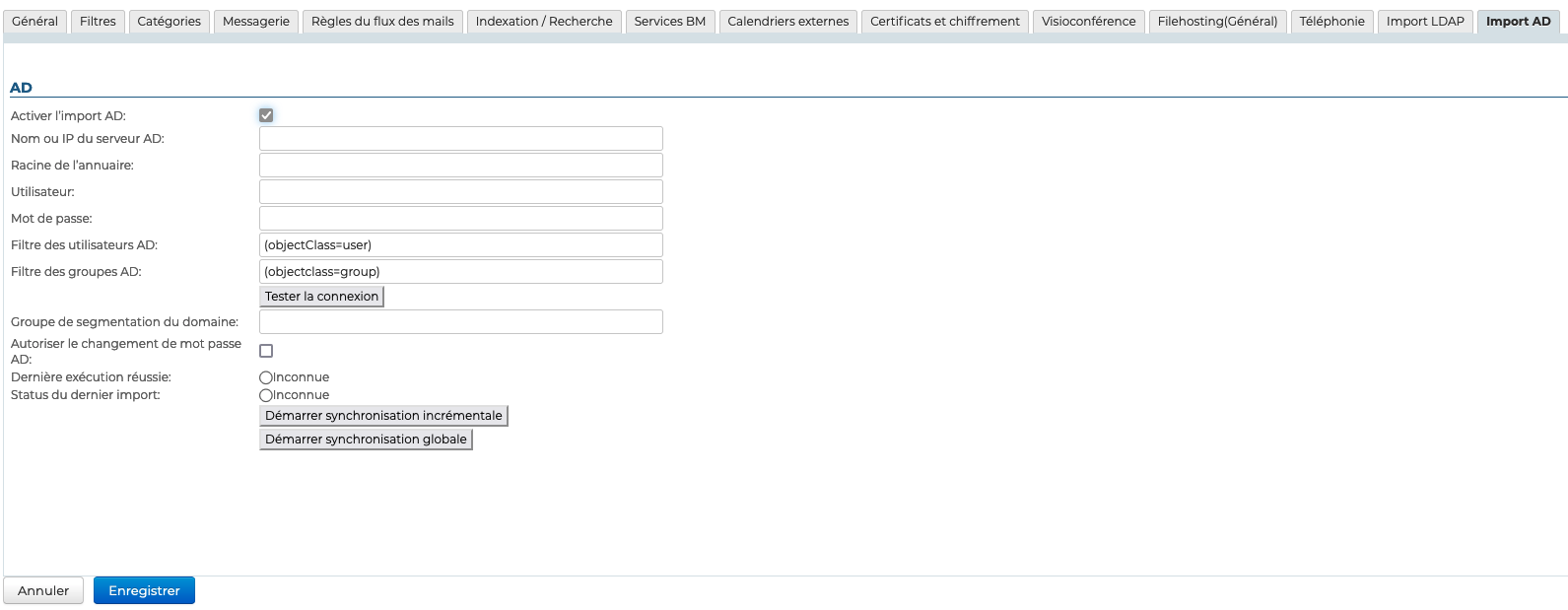 Le mode incrémental de l'import prend en compte les modifications faites dans AD depuis cette date.Statut du dernier import Date et statut de la dernière exécution de l'import AD.