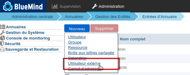 1. Depuis la page d'accueil de la gestion des Annuaires, cliquer sur "Créer un utilisateur externe" ou depuis la liste des entrées d'annuaire utiliser le bouton Nouveau > Utilisateur externe :