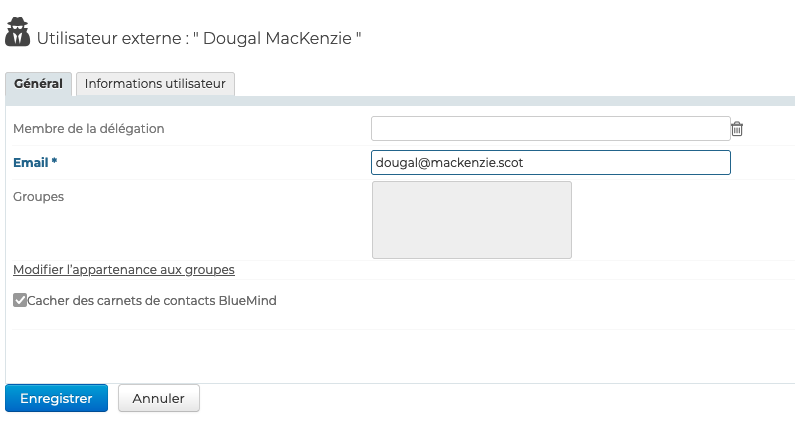 L'onglet Général de la fiche d'un utilisateur permet de compléter/modifier les champs remplis lors de la création de l'utilisateur mais aussi de modifier les groupes auxquels il appartient :