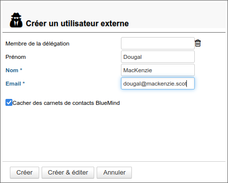 3. Cliquer sur « Créer » pour une création simple et directe de l'utilisateur ou cliquer sur « Créer & éditer » pour créer l'utilisateur externe et accéder aux options de configuration.