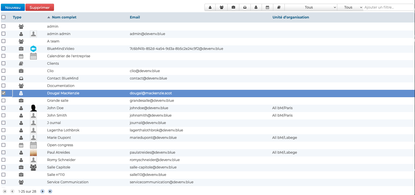 • Cacher des carnets de contacts BlueMind : l'utilisateur pourra être membre d'un groupe mais sa fiche n'apparaîtra pas dans l'annuaire - cette option est active par défaut, elle peut être désactivée/réactivée à tout moment par la suite