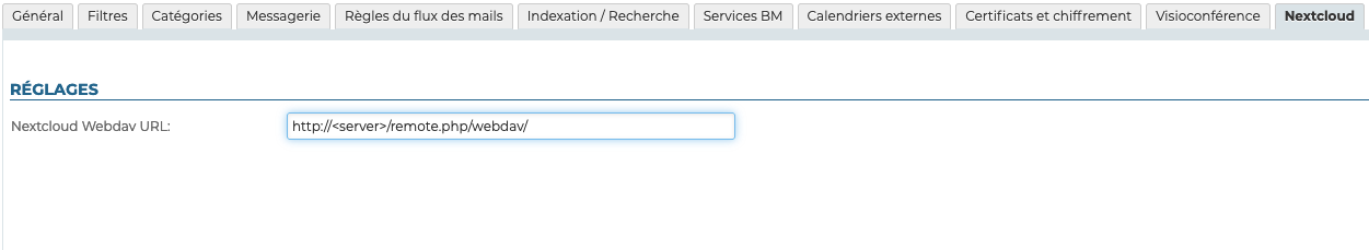 La connexion de BlueMind à Nextcloud pour l'ensemble des domaines se fait depuis la configuration système de la console d'administration :