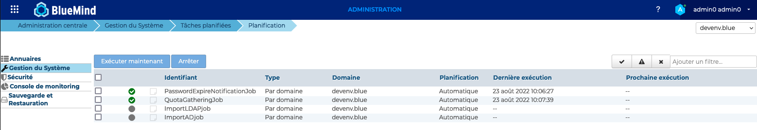 Tous les administrateurs n'ont pas accès aux mêmes tâches : l'administrateur système voit toutes les tâches des domaines supervisés, l'administrateur du domaine n'a accès qu'aux tâches propres à son domaine.