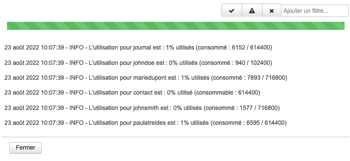 • icône d'état des logs : elle est noire lorsqu'il y a des logs non lus, soit pendant ou après une exécution. Un clic sur l'icône ouvre la popup de visualisation, les messages y sont affichés en temps réel lorsque la tâche est en cours d'exécution :