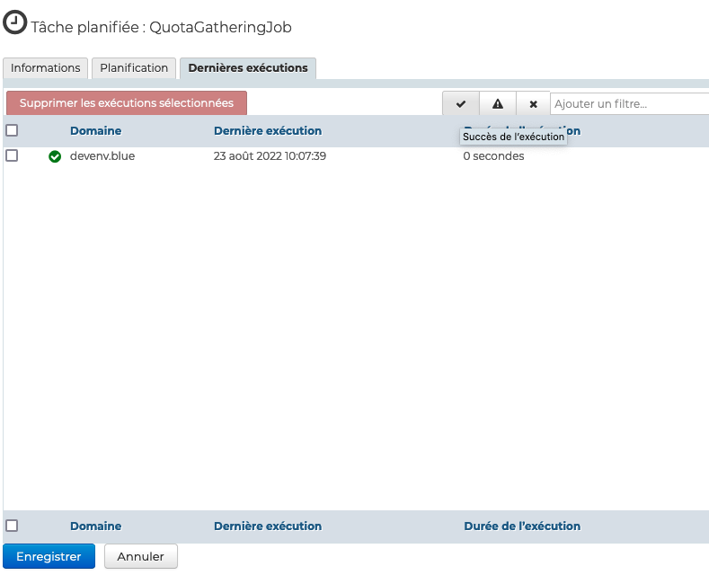Ici aussi les outils de filtres sont disponibles afin de visualiser seulement certaines tâches. Par exemple ci-dessus seules sont affichées les exécutions réussies.