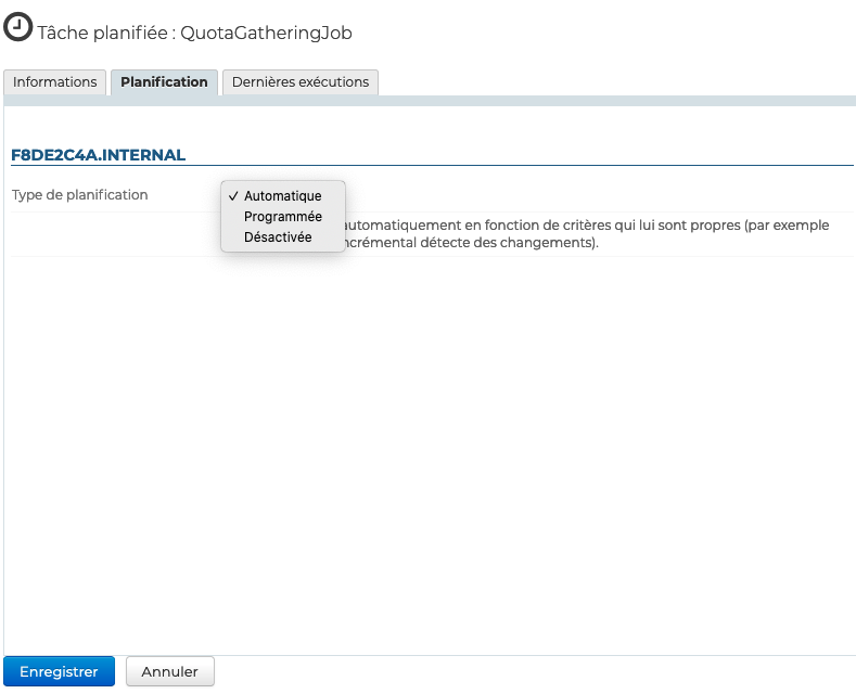 • automatique : la tâche est lancée en fonction de critères qui lui sont propres et ont été définis lors du développement, c'est le comportement par défaut d'une tâche planifiée.