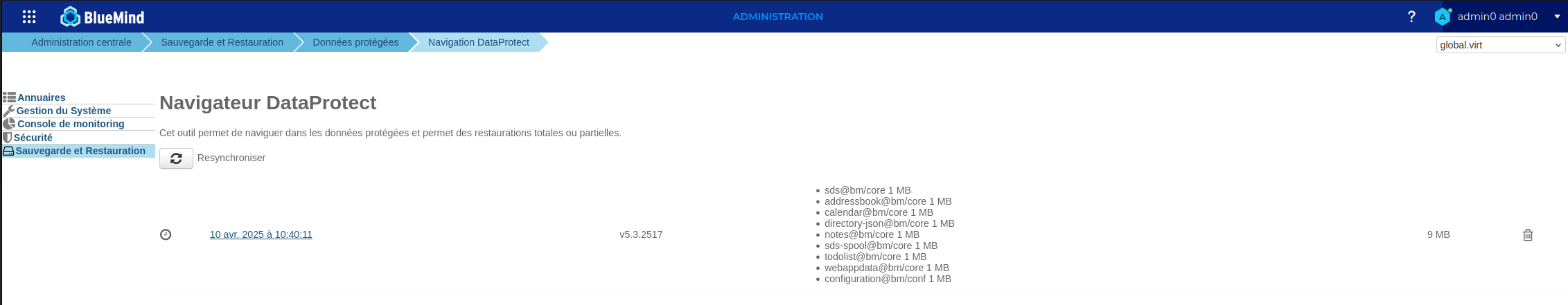→ La page présente les sauvegardes réalisées par BlueMind et actuellement accessibles.💡 Nombre de sauvegardes présentes
