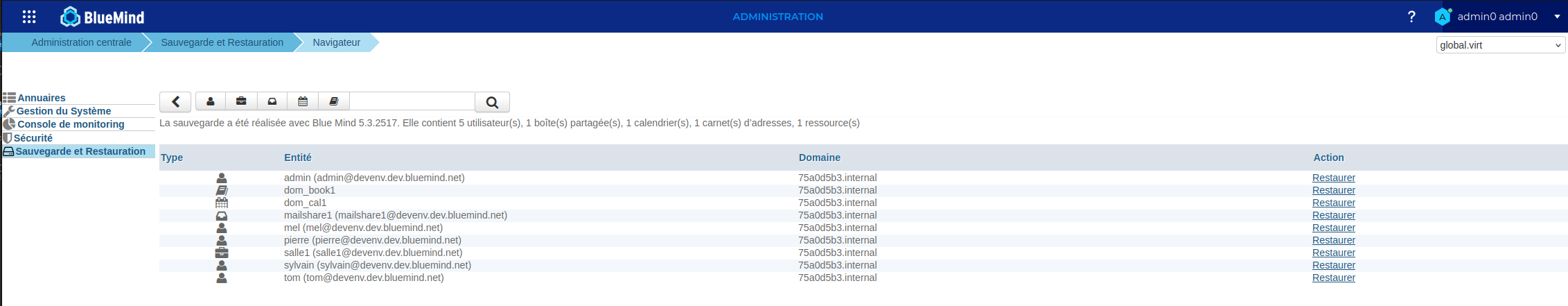 Le système recherche les entités disponibles dans la sauvegarde sélectionnée. Le navigateur présente alors les données contenues dans la sauvegarde par entité :