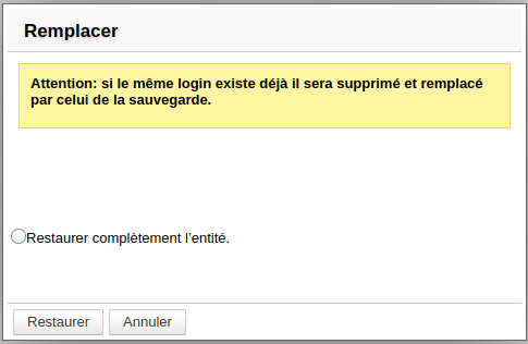 L'entité préalablement supprimée ou recréée sera complètement remplacée par celle de la sauvegarde.