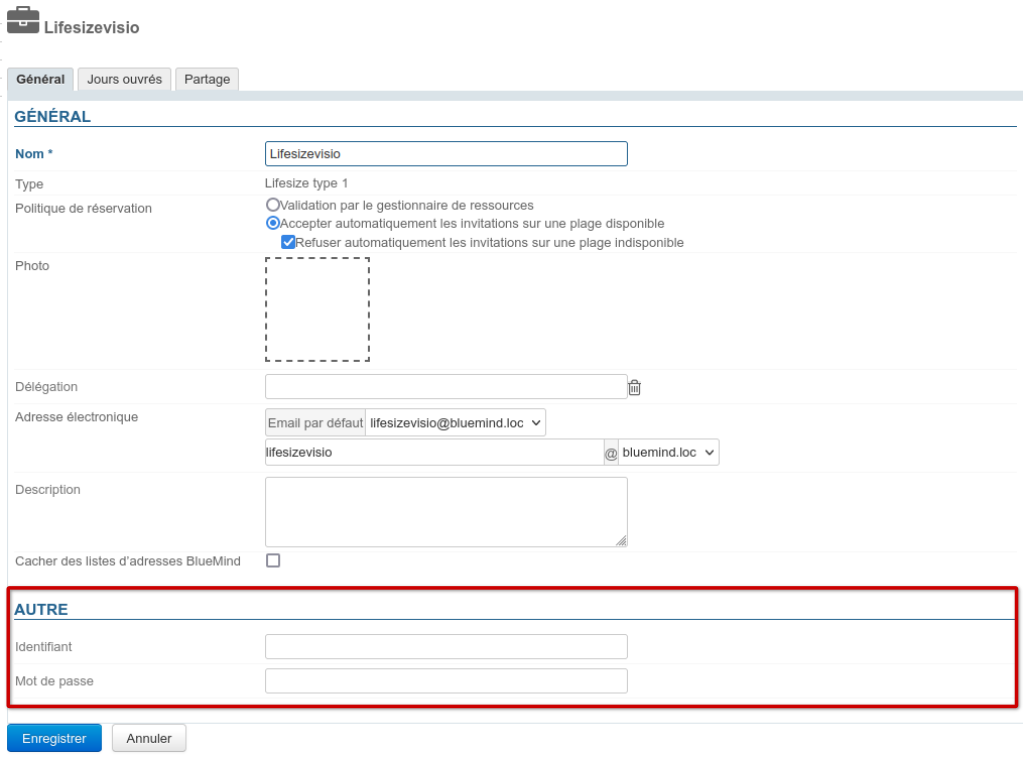 Se rendre ensuite dans la fiche de la ressource > onglet Général > section Autre et renseigner les identifiants de connexion au serveur Lifesize :