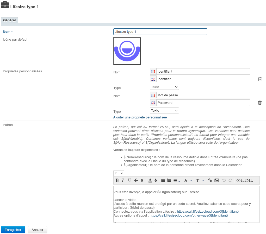 Un patron de contenu est défini par défaut et peut être personnalisé dans la gestion du type de ressource Lifesize type 1 créé lors de l'installation du paquet :