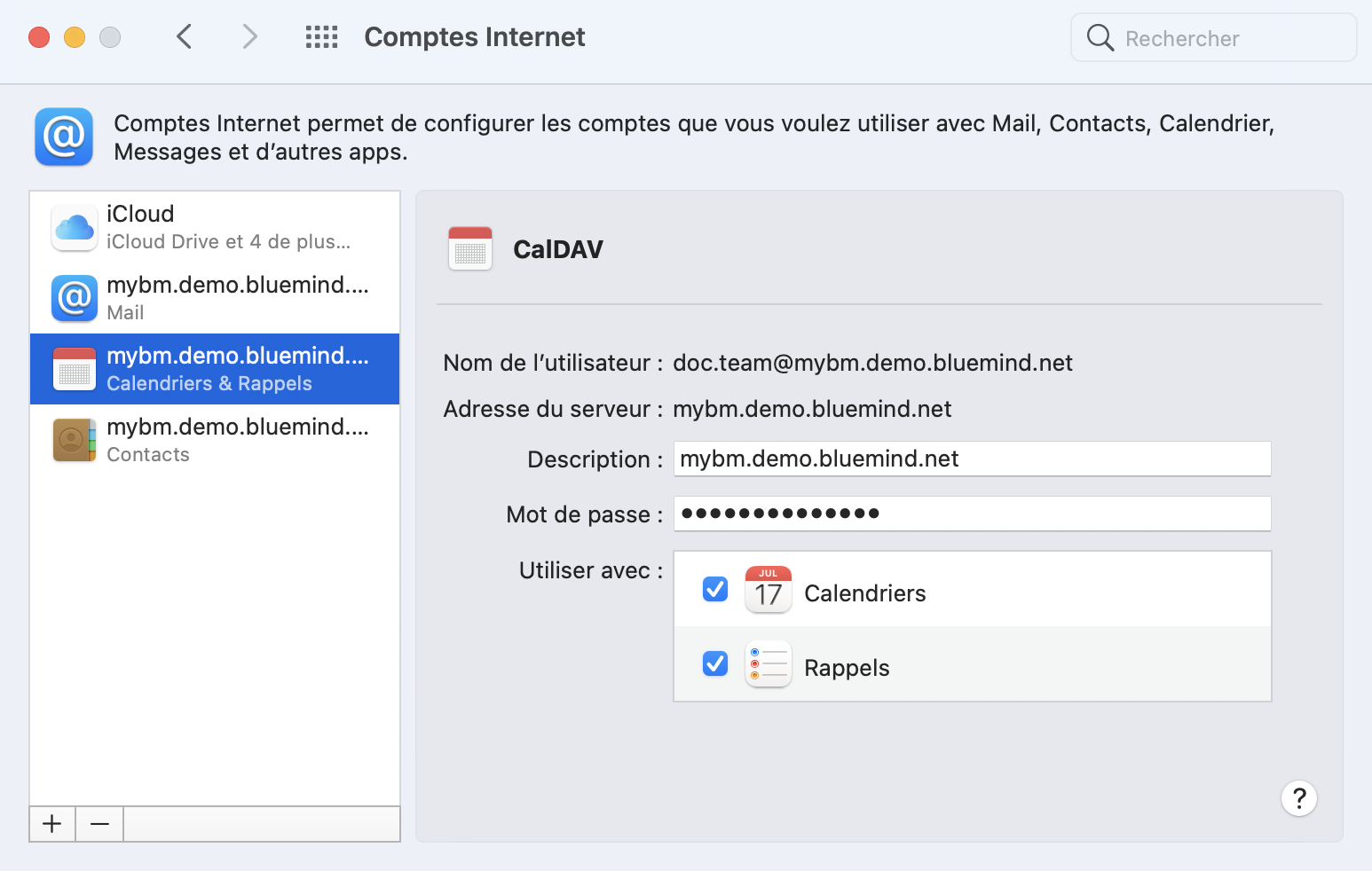 Il faut créer un compte par application. Pour utiliser l'ensemble des applications BlueMind il faut donc créer 3 comptes : Mail, Calendrier et Contacts