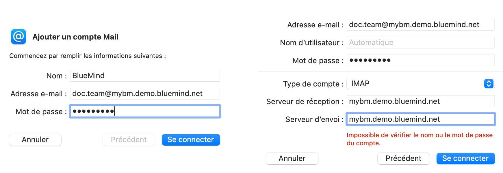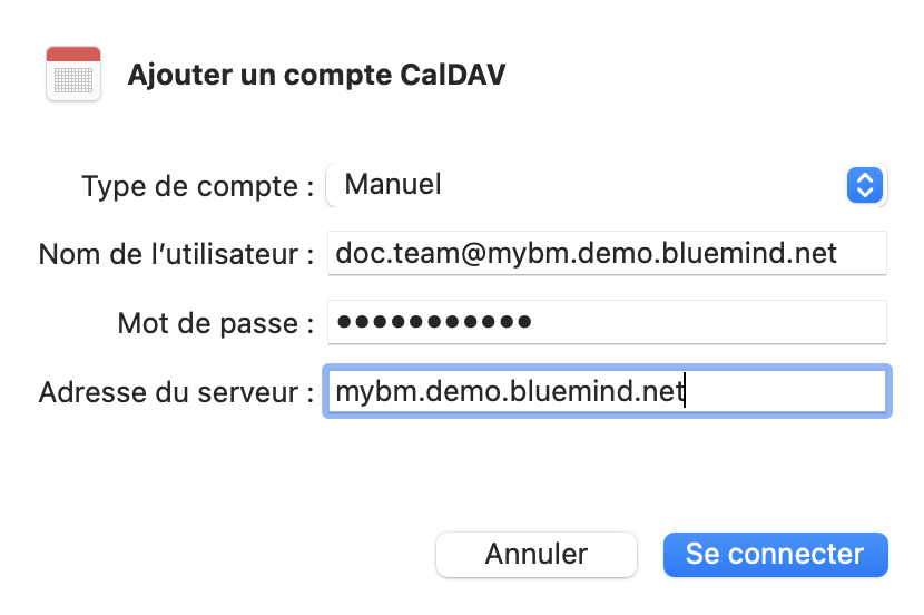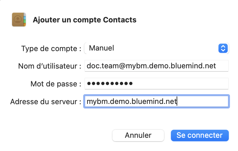 • Mot de passe : mot de passe qui a été fourni par l'administrateur et permet de se connecter à BlueMind