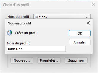 2. Créer un nouveau profil Outlook : le compte ne doit pas être ajouté dans un profil déjà existant, y compris le profil par défaut lors du lancement du logiciel.