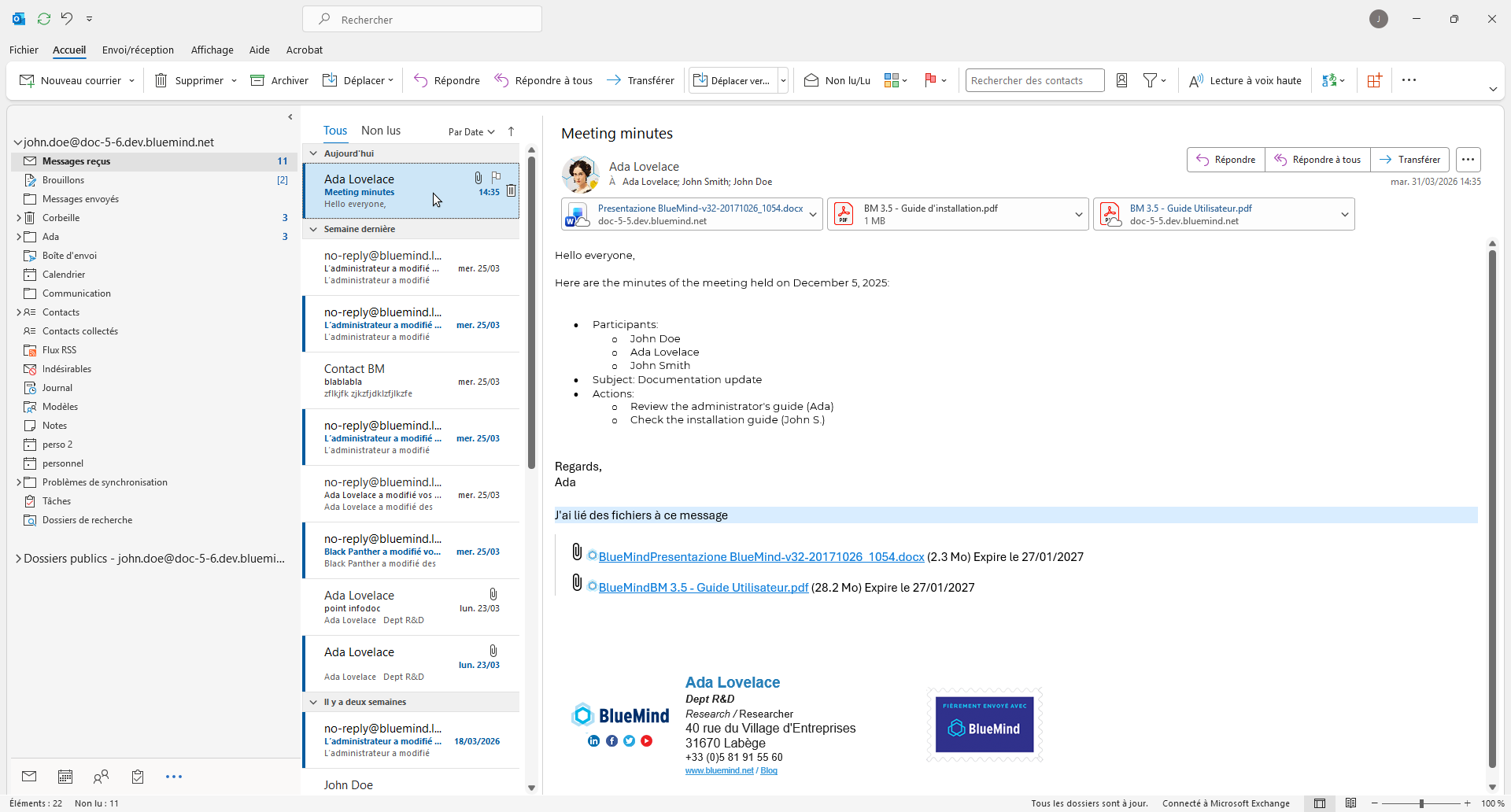 Grâce à la prise en charge de MAPI, vous pouvez utiliser pleinement toutes les fonctionnalités de votre Outlook connecté à votre messagerie BlueMind.