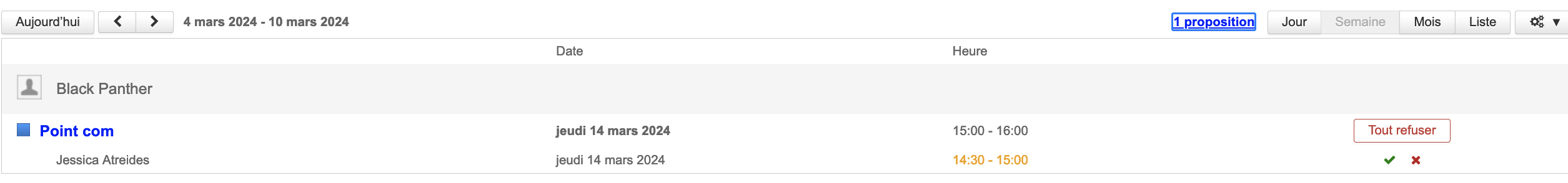 Lorsqu'un utilisateur envoie une proposition un nouvel horaire, l'organisateur, ou son délégué (voir Gérer les délégations), peut accepter ou refuser la proposition via la notification reçue par mail ou dans la barre d'actions de son Agenda :