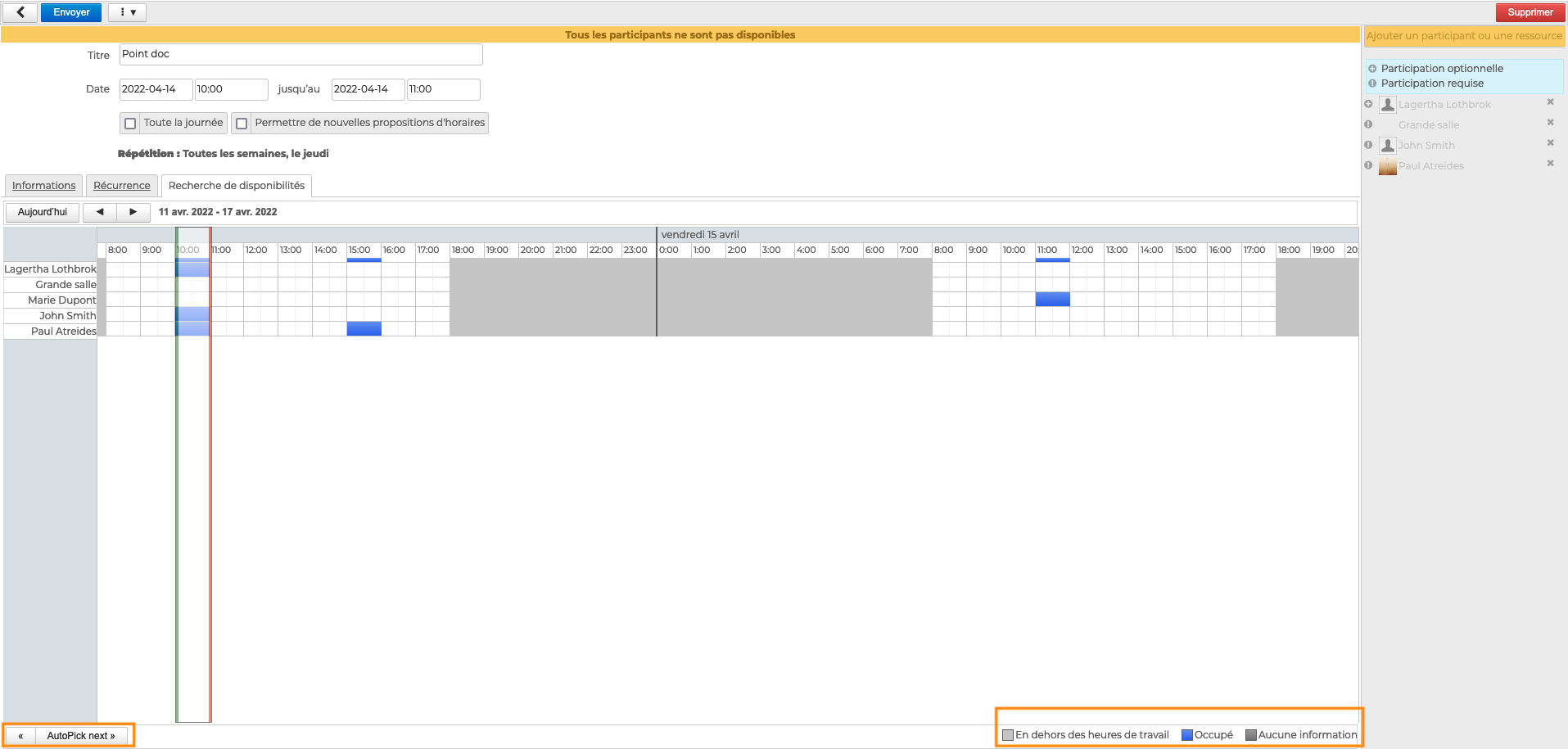 BlueMind propose automatiquement, encadré de vert et rouge, le premier créneau disponible en fonction de la date saisie dans le formulaire. Pour aller automatiquement au prochain créneau, cliquer sur "Autopick next" en bas à gauche.