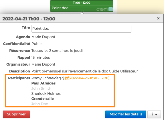 - tous les participants reçoivent un e-mail de modification de l'événement.