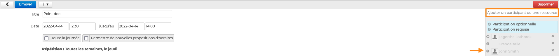La réservation d'une ressource, c'est-à-dire un moyen (salle de réunion, véhicule, rétroprojecteur, etc.) mis à disposition des utilisateurs, s'effectue de la même façon que l'invitation des participants : aller dans la partie droite de la page et taper les premières lettres de la ressource - l'autocomplétion proposera l’ensemble des ressources partagées par l'administrateur.