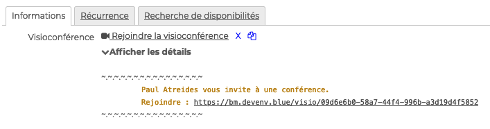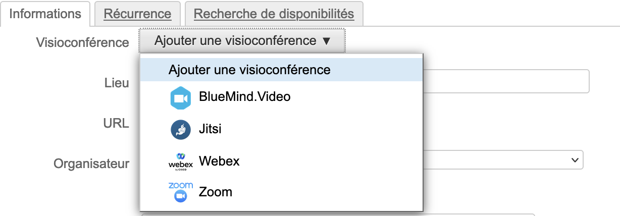 BlueMind propose la possibilité de lier des visioconférences à des événements grâce à plusieurs solutions :