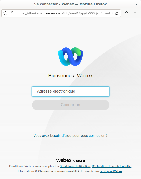 Il s'agit de l'adresse mail de votre compte utilisateur Webex. Si vous n'avez pas de compte Webex, veuillez vous rapprocher de vos administrateurs.