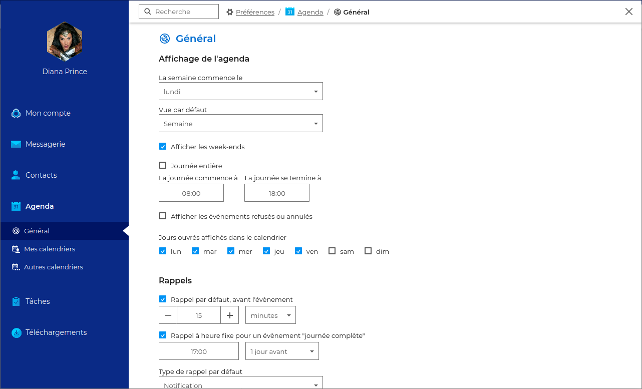 Les paramètres généraux de l'agenda permettent à l'utilisateur de définir ses préférences d'affichage, de gestion du temps et de rappels.