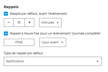 - un rappel pour les événements sur une journée complète : indique l'heure du rappel et le nombre jours avant l'évènement