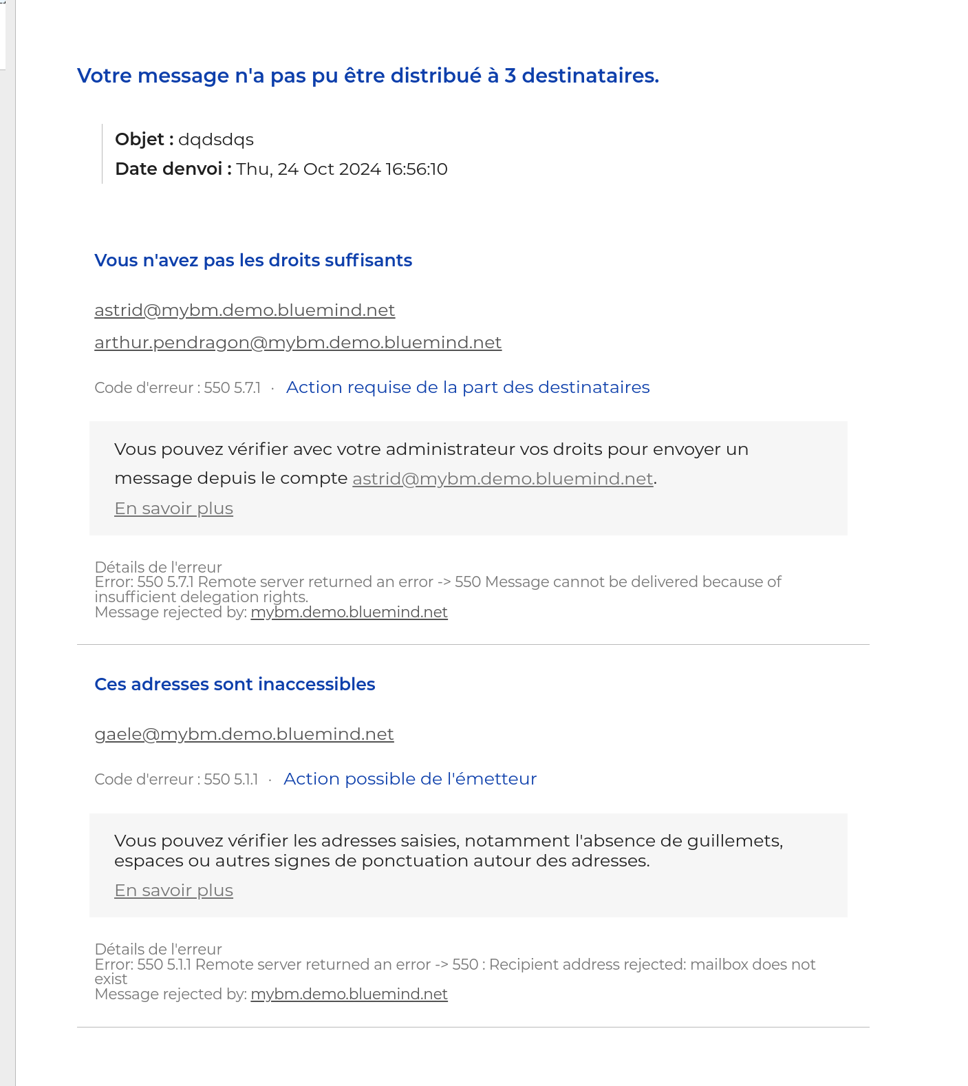 Le client de messagerie de BlueMind s'efforce d'interpréter les messages d'erreurs reçus afin de présenter à l'utilisateur une information la plus claire possible sur le problème rencontré et qu'il puisse éventuellement corriger son message afin qu'il parvienne à son destinataire :