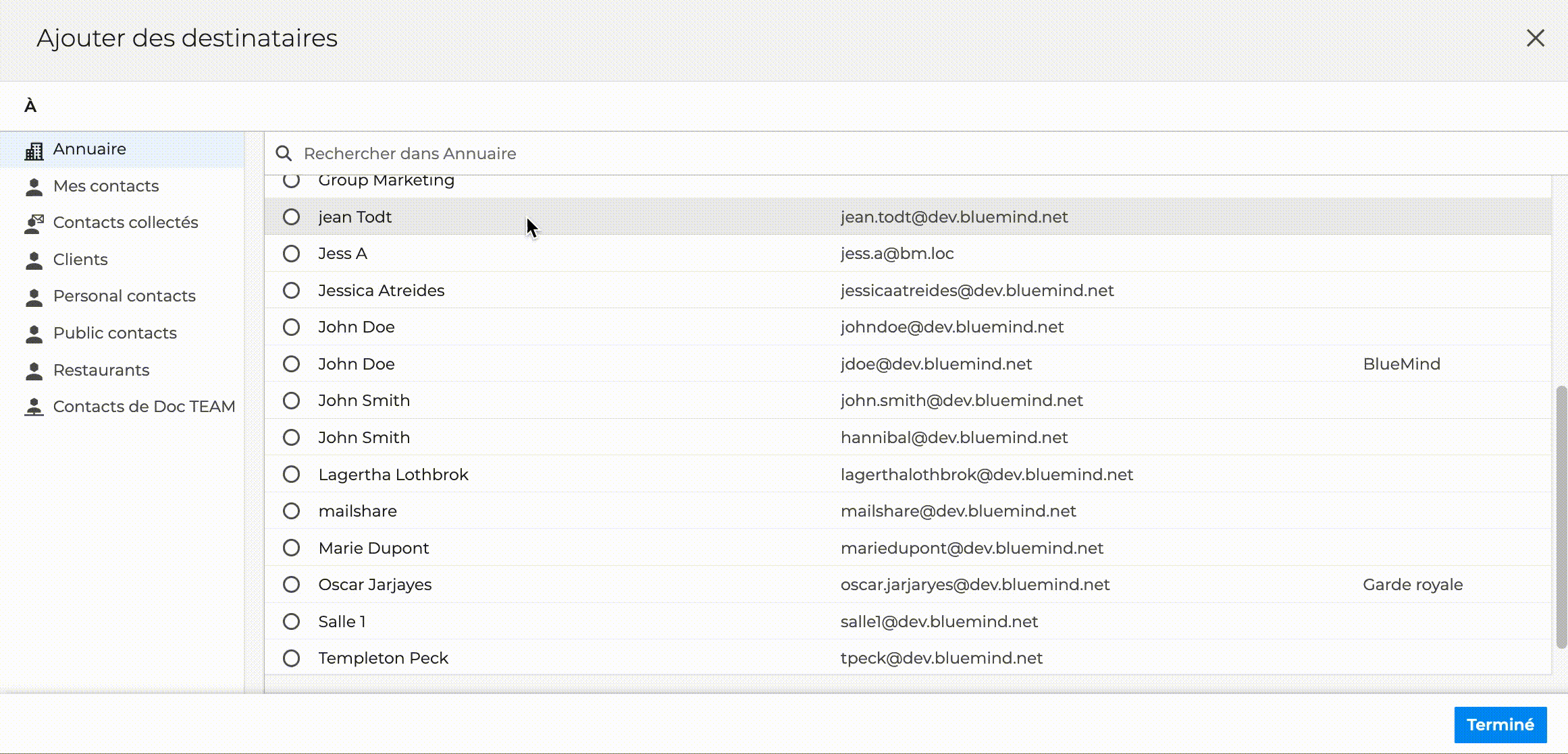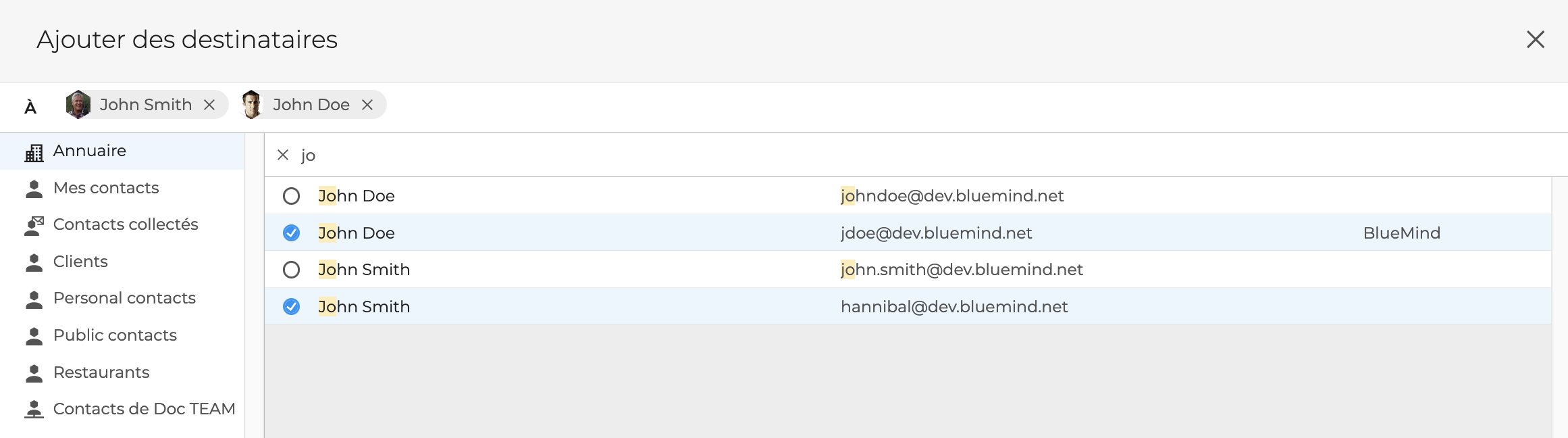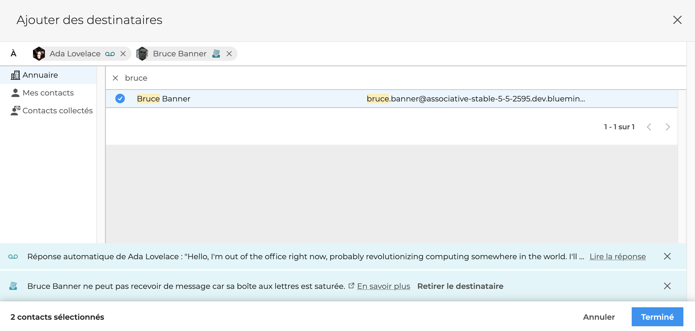 BlueMind permet également de rechercher et sélectionner un ou plusieurs destinataires dans les carnets d'adresses de l'utilisateur sans quitter la messagerie.