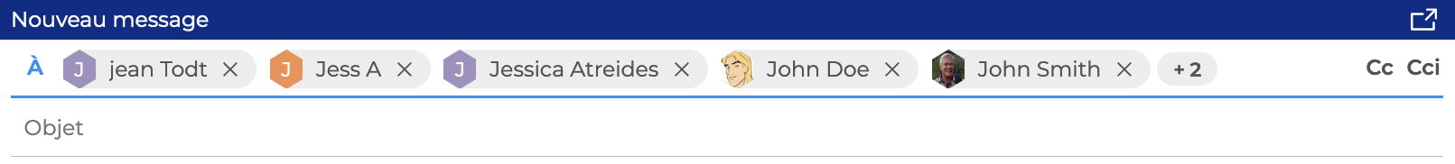 Pour ajouter un destinataire, saisir les premiers caractères. Les champs À, Cc ou Cci proposent des suggestions parmi tous les contacts enregistrés dans les carnets personnels de l'utilisateur et dans l'annuaire :