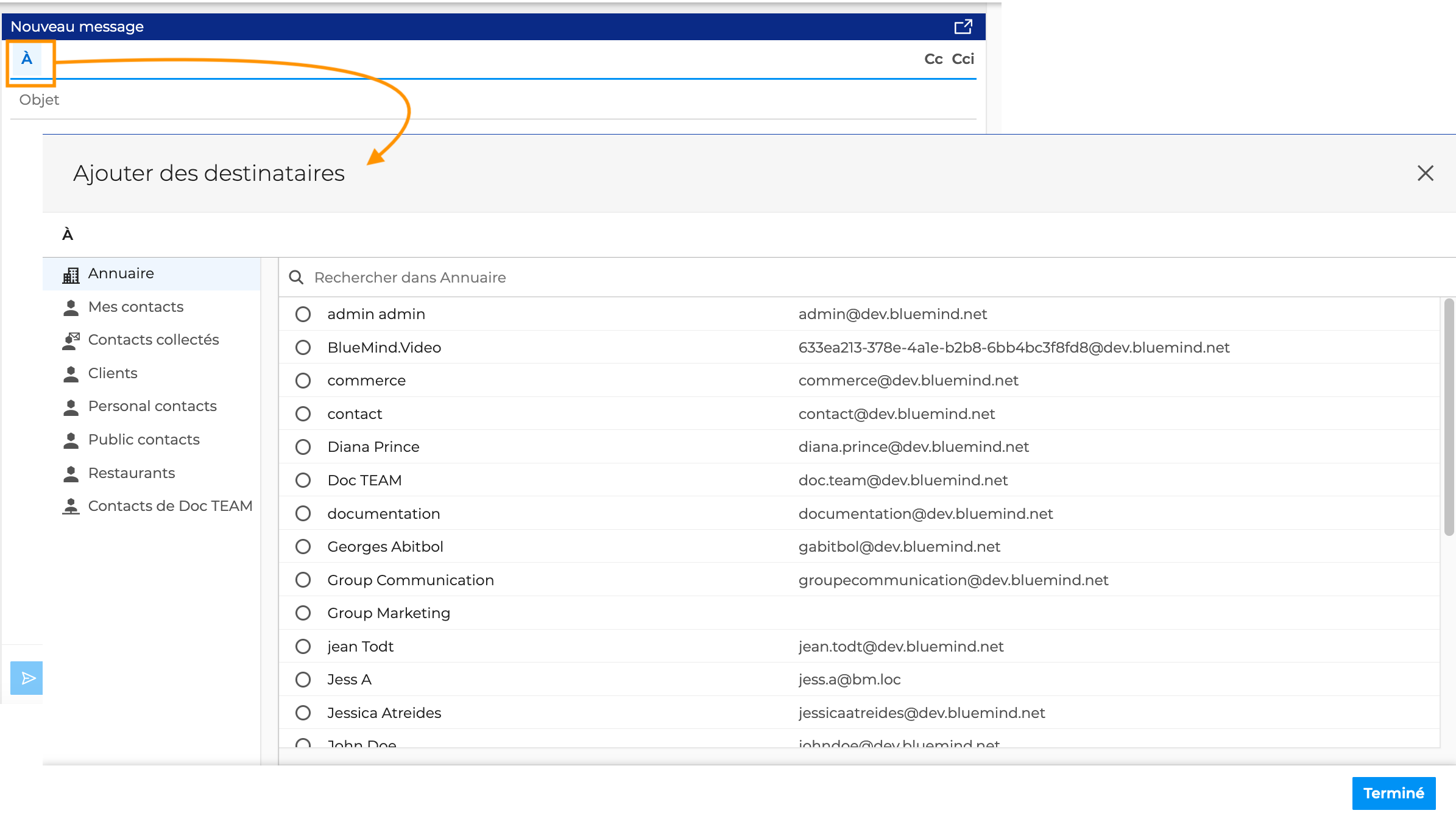 Pour cela, ouvrir le sélecteur de contacts en cliquant sur le champ souhaité À, Cc, Cci :