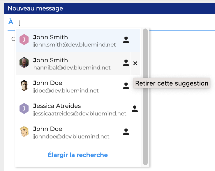 Pour sélectionner un destinataire dans la liste de suggestions, cliquer sur le contact souhaité (ou taper Entrée).