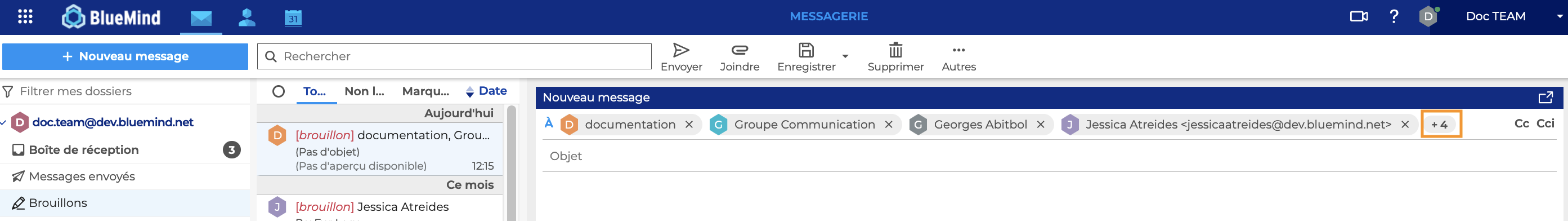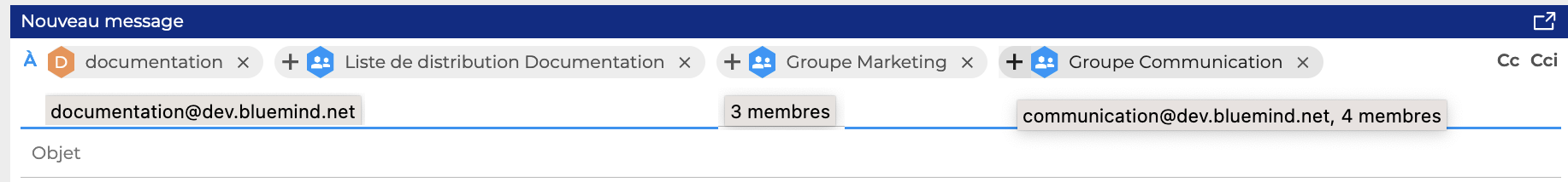 BlueMind permet d'envoyer des messages à un ensemble de contacts en utilisant les listes de distribution, les groupes avec ou sans adresse mail et les boites partagées.