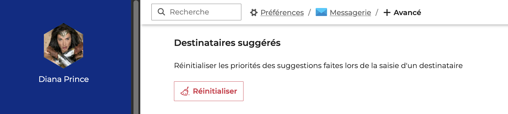 Pour réinitialiser le système de pertinence, aller dans les paramètres de la messagerie : Préférences > Messagerie > + Avancé > Destinataires suggérés et cliquer sur "Réinitialiser" :