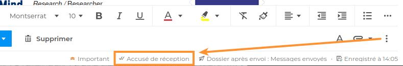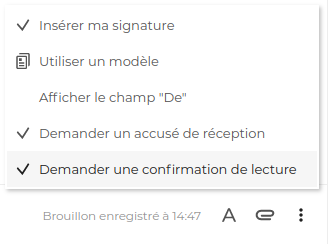 Pour demander un accusé de réception ou une confirmation de lecture sur un message en cours de rédaction, utiliser le menu en bas à droite du composeur :