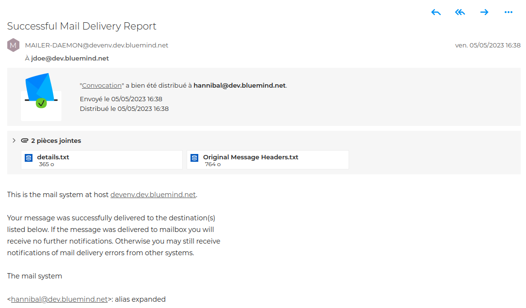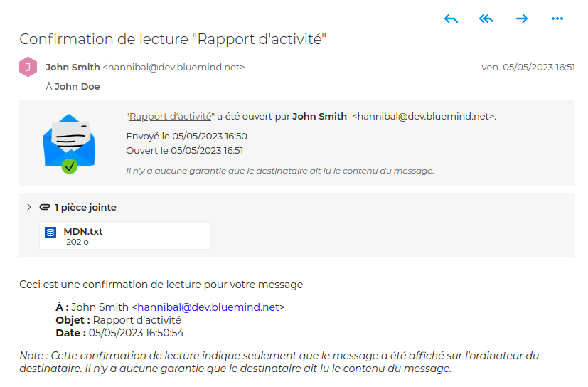Les accusés de réception et demandes de confirmation de lecture ainsi reçus sont présentés par BlueMind avec un encart indiquant de façon claire le statut du message, suivi du message de l'accusé lui-même :