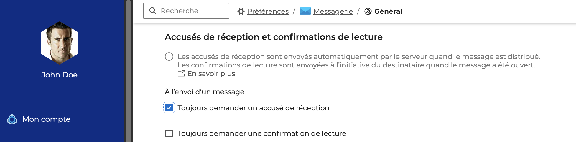 Pour activer une demande systématique d'accusé de réception ou de confirmation de lecture sur tous les messages émis, se rendre dans la gestion des préférences : Préférences > Messagerie > Général > Accusés de réception et confirmations de lecture et activer le ou les types de demande souhaités :