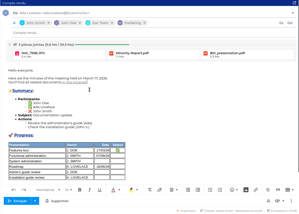 Le composeur de la messagerie BlueMind permet de créer facilement des messages au format HTML avec du texte enrichi, des images, tableaux ou encore des liens :