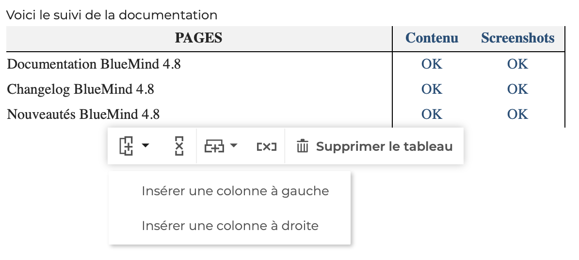 Pour insérer un tableau, cliquer sur ou copier un tableau Excel, OpenOffice ou LibreOffice directement dans le corps du message. Il est ensute possible d'ajouer des lignes et des colonnes en cliquant sur les icônes avec un