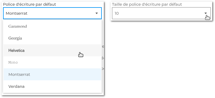 Chaque utilisateur peut définir la police qu'il souhaite utiliser par défaut, ainsi que sa taille, lors de la rédaction de ses messages. Pour cela, se rendre dans les paramètres de la messagerie : Préférences > Messagerie > Général > Écriture des messages et choisir la police et la taille souhaitées grâce aux listes déroulantes :