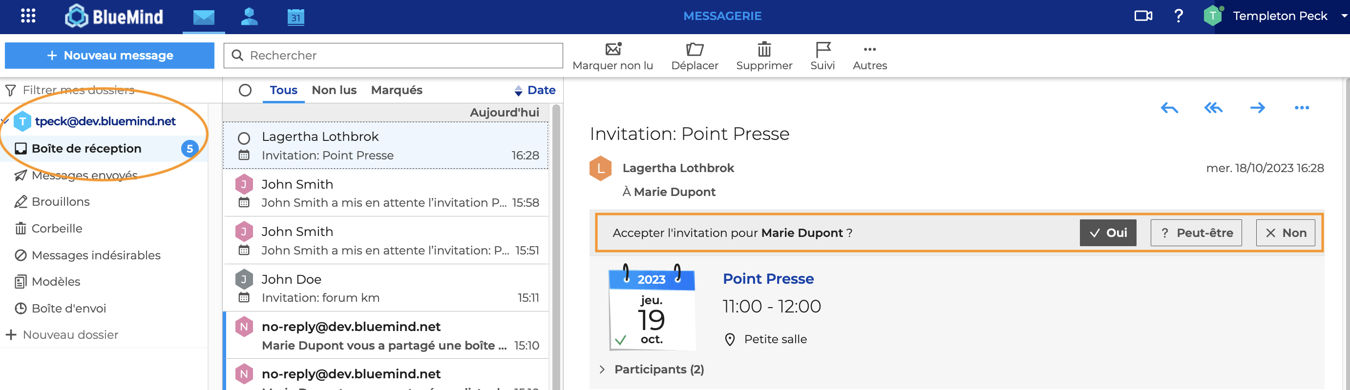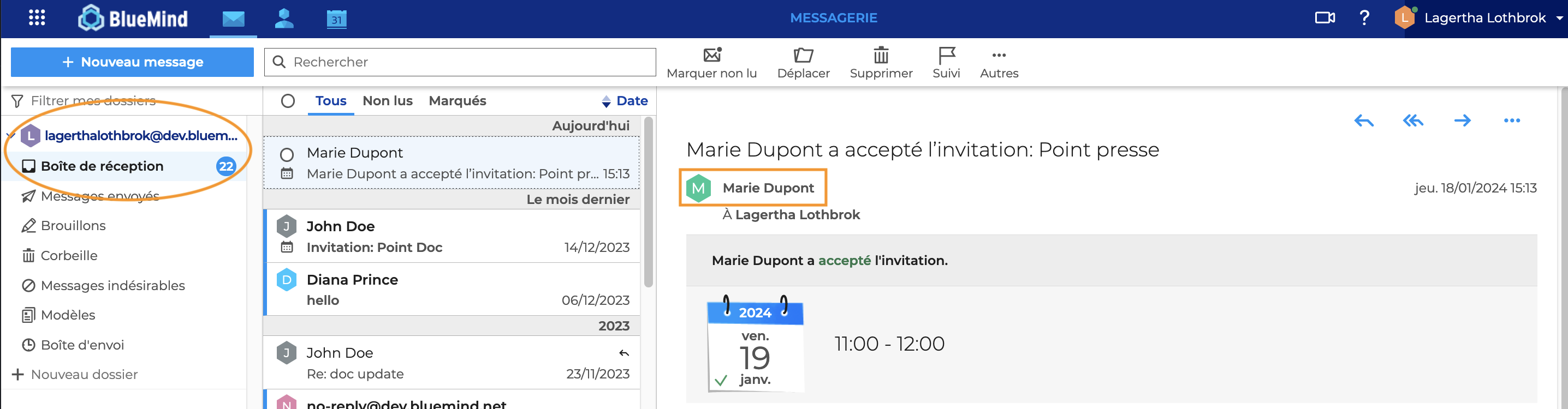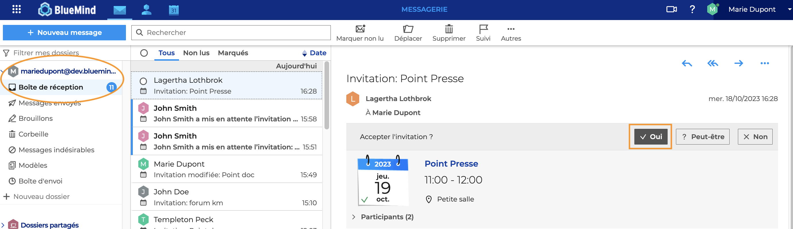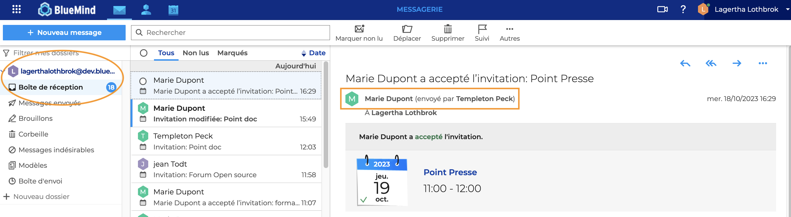 Celui-ci reçoit alors toutes les notifications liées aux invitations (invitations aux réunions publiques, modifications, réponses, propositions de nouvel horaire et réservations de ressources) sur sa boîte aux lettres et peut y répondre depuis sa messagerie.