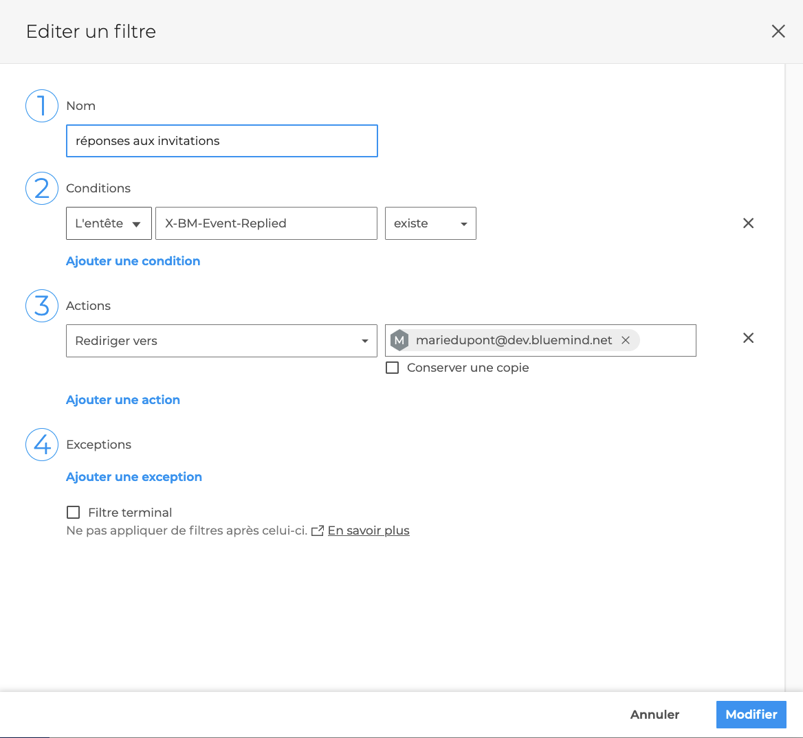 • Pour les réponses aux invitations, créer un filtre avec la condition "L'entête existe" et indiquer X‑BM‑Event‑Replied dans le champ "Le nom de l'entête" :