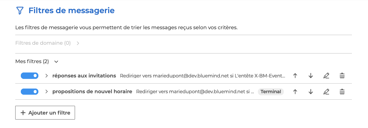 Ce dernier reçoit une notification par e-mail pour chaque réponse. Il reçoit également des notifications lorsqu'un invité propose un nouvel horaire ou transfère l'invitation. Afin de faciliter la gestion de ces notifications, il est possible de mettre en place des filtres spécifiques à ce type de messages.