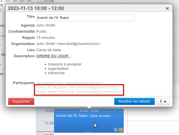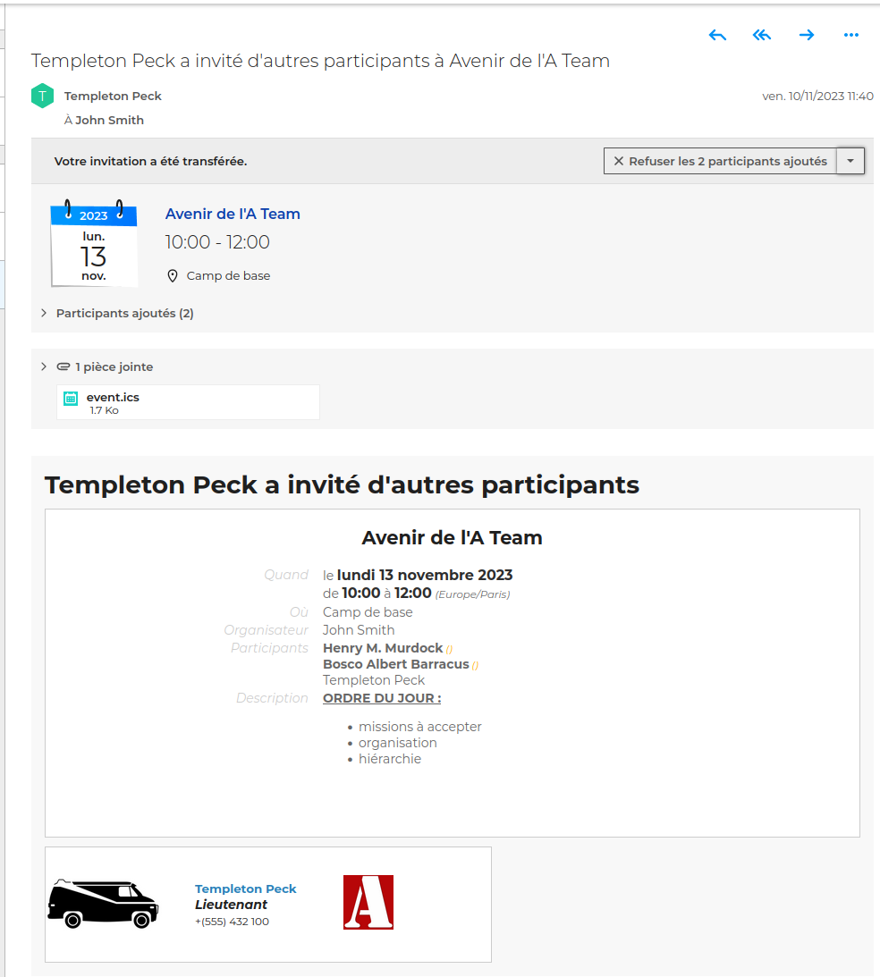 Le message qu'il reçoit lui présente les caractéristiques de la réunion avec la liste des participants mise à jour :