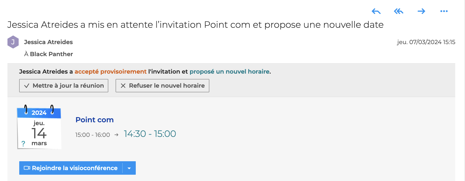 L'organisateur peut alors accepter ou refuser la proposition. Consulter la page Organiser une réunion pour plus d'informations.