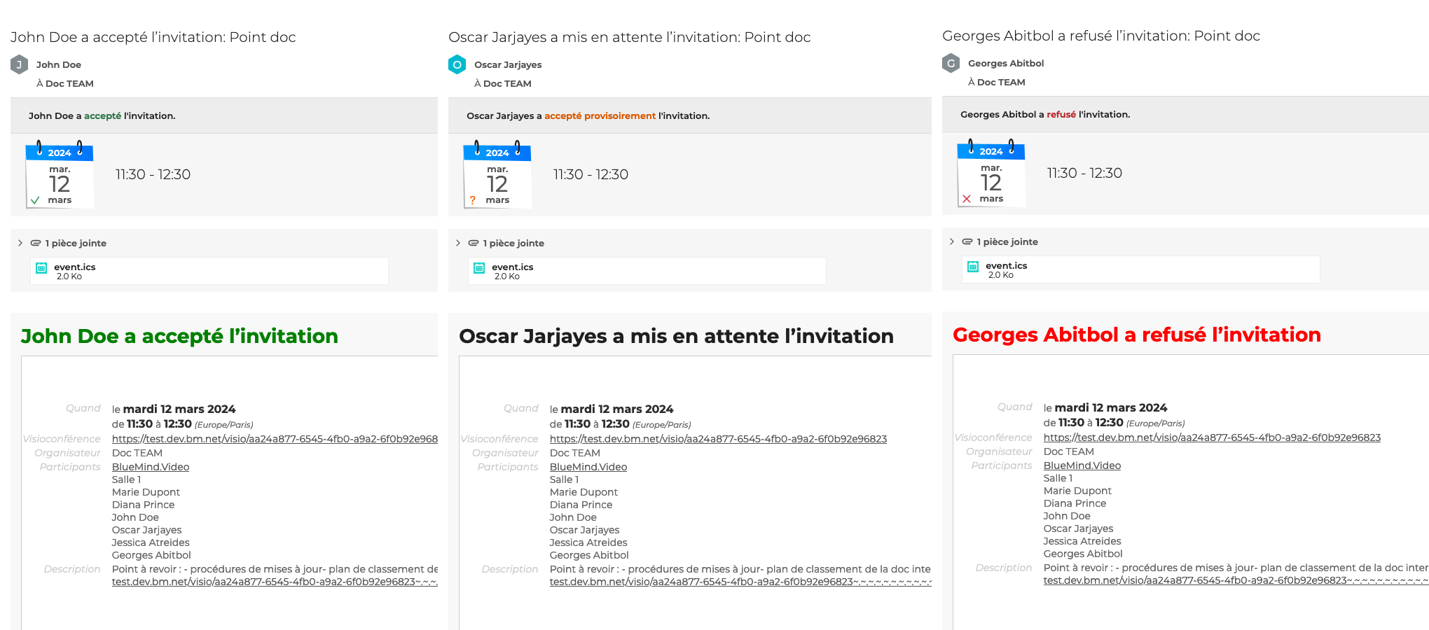 Comme pour toute invitation, l'organisateur est informé de la participation des nouveaux invités via une notification et la liste des participants est mise à jour dans l'événement de son calendrier. Consulter la page Organiser une réunion pour plus d'informations.