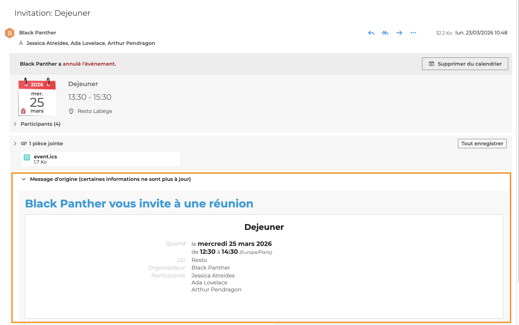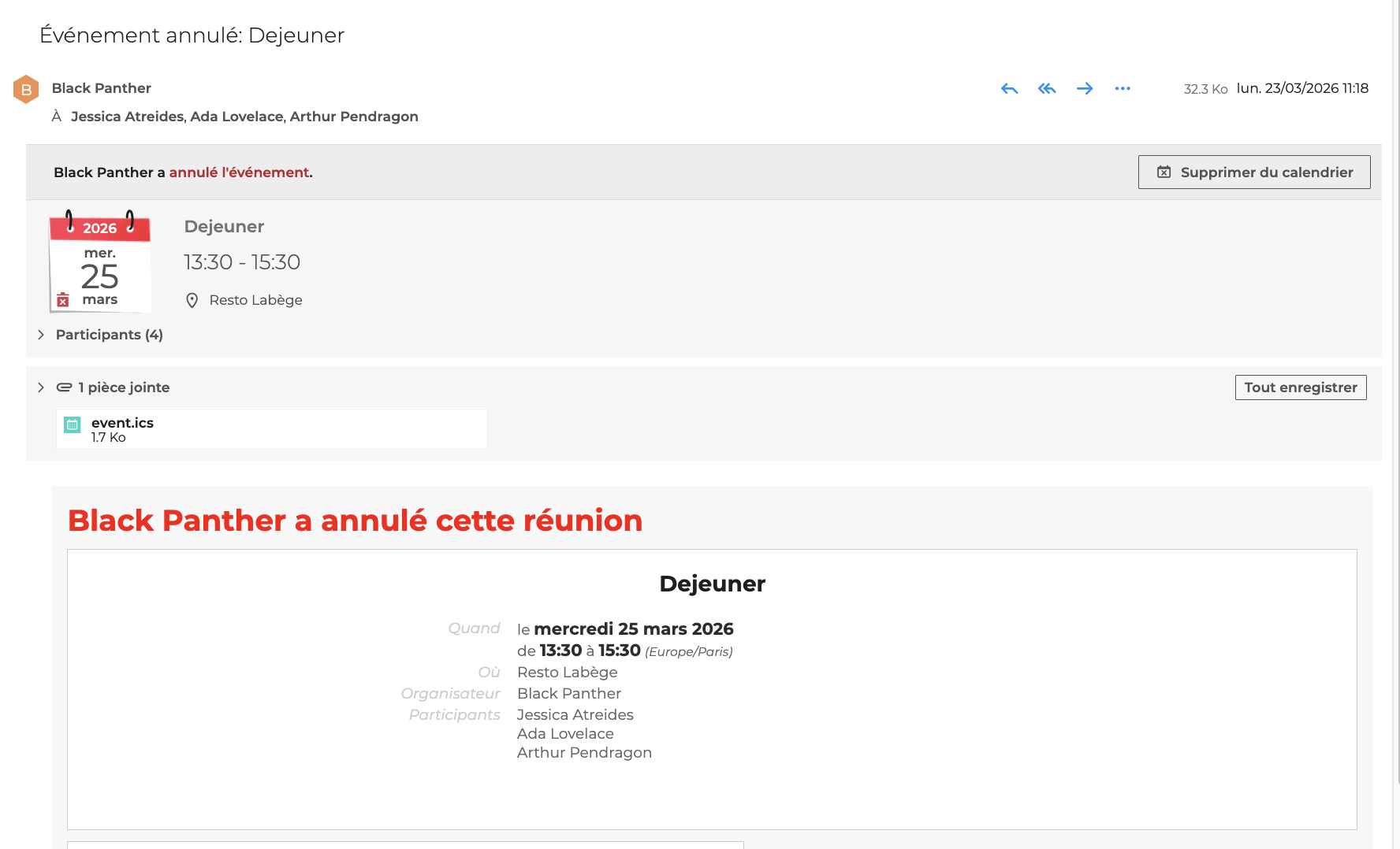 L'utilisateur peut la supprimer de son calendrier directement depuis l'e-mail, en cliquant sur "Supprimer du calendrier".