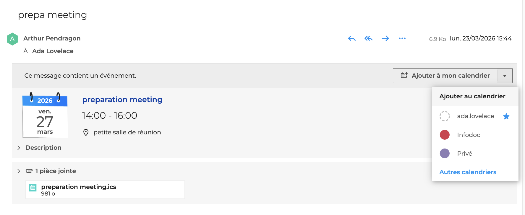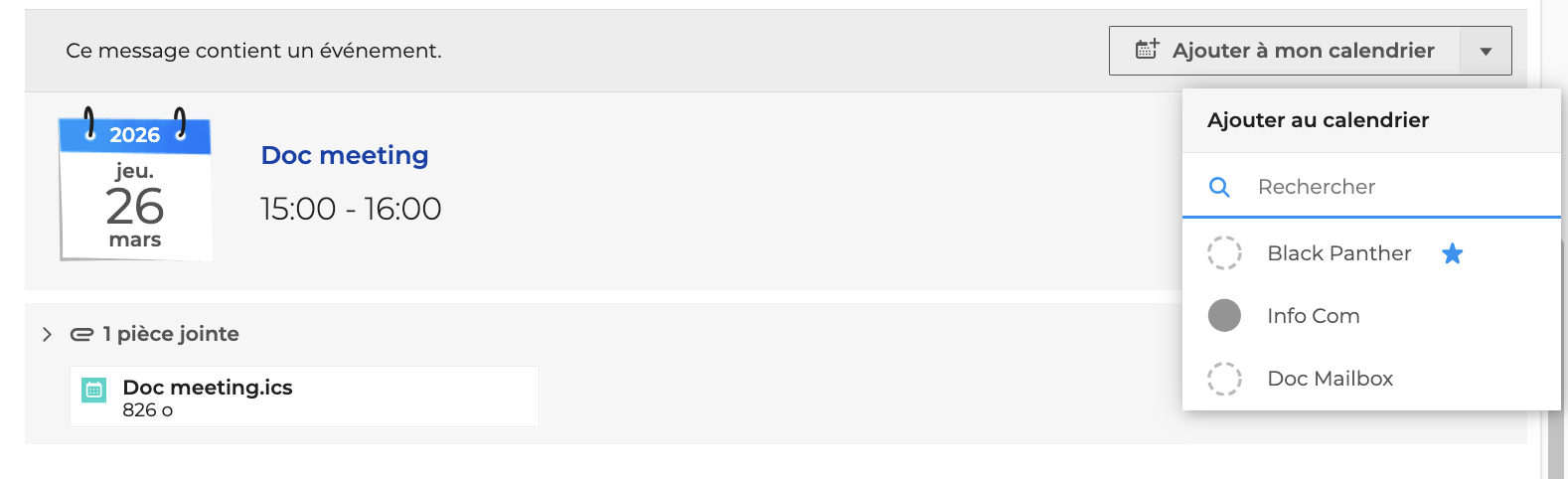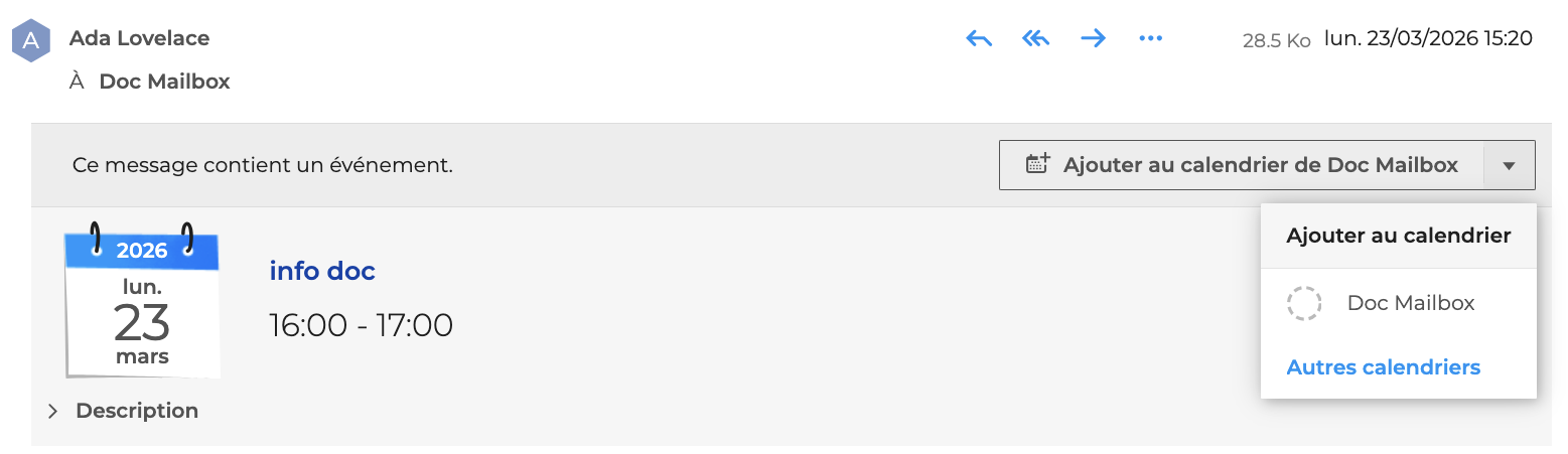 La notification indique que le message contient un évènement, le détail des informations est indiqué dans la description et l'utilisateur peut l'ajouter à l'un de ses calendriers en cliquant sur "Ajouter à mon calendrier".