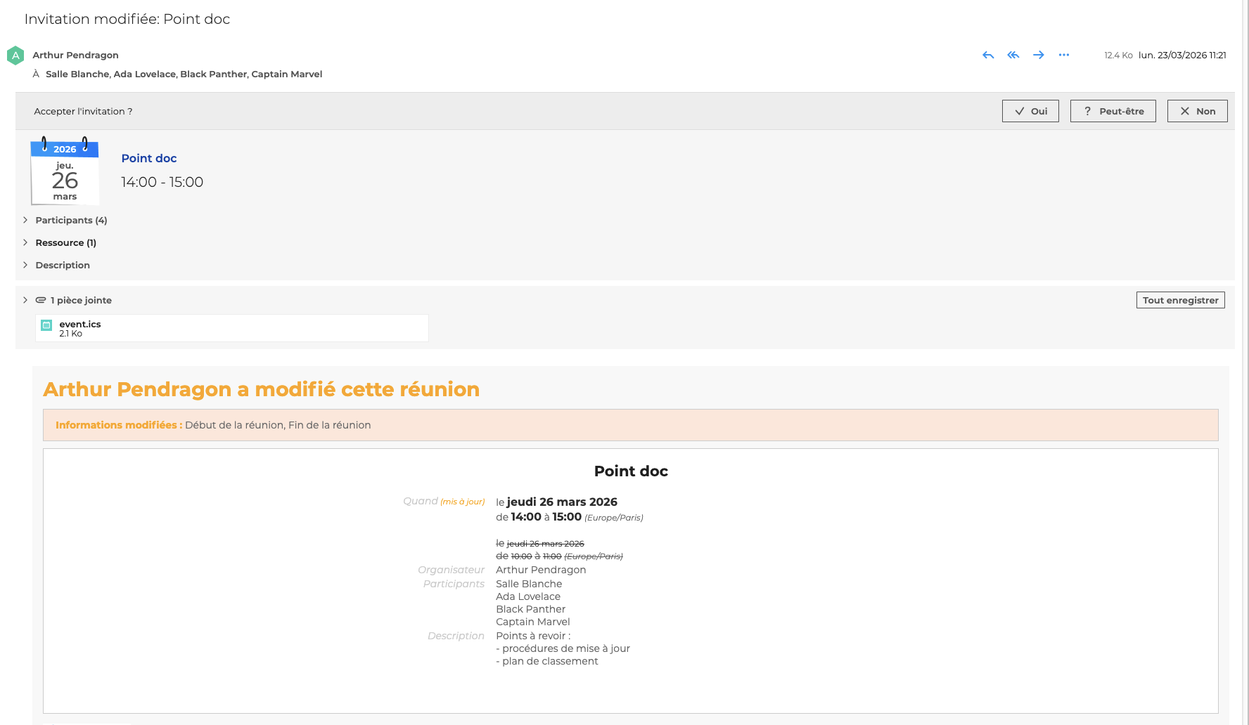 Dans le cas d'un changement d'horaire, de lieu ou bien encore de la description, l'objet de l'e-mail indique qu'il s'agit d'une modification et le détail des informations mises à jour est précisé dans la description.