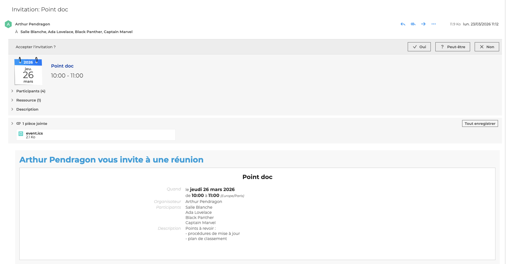Lorsqu'une réunion est organisée depuis l'application L'agenda, les invités reçoivent systématiquement une notification par e-mail leur permettant de consulter les détails de l'évènement, de répondre à l'invitation ou bien encore la transférer à un tiers.